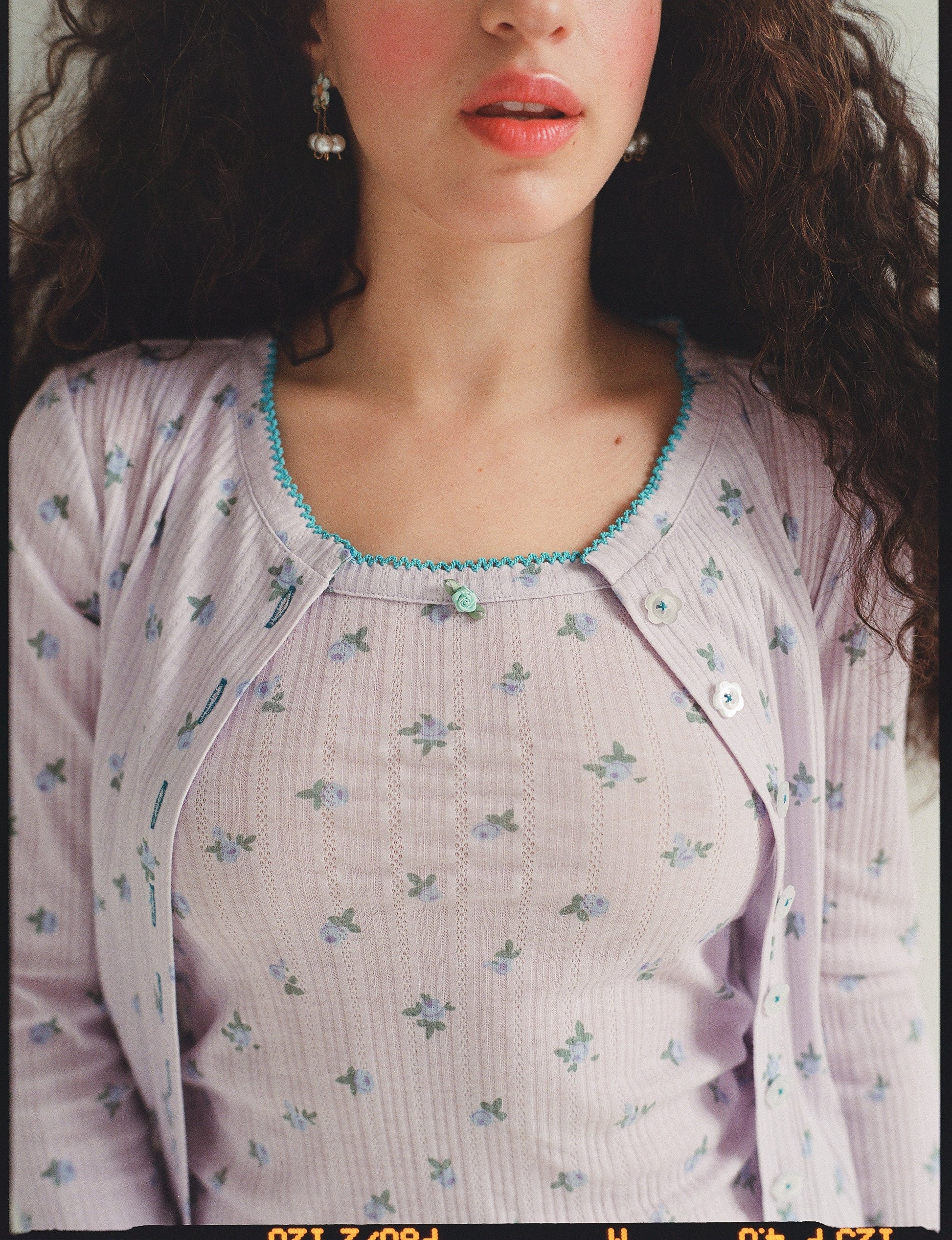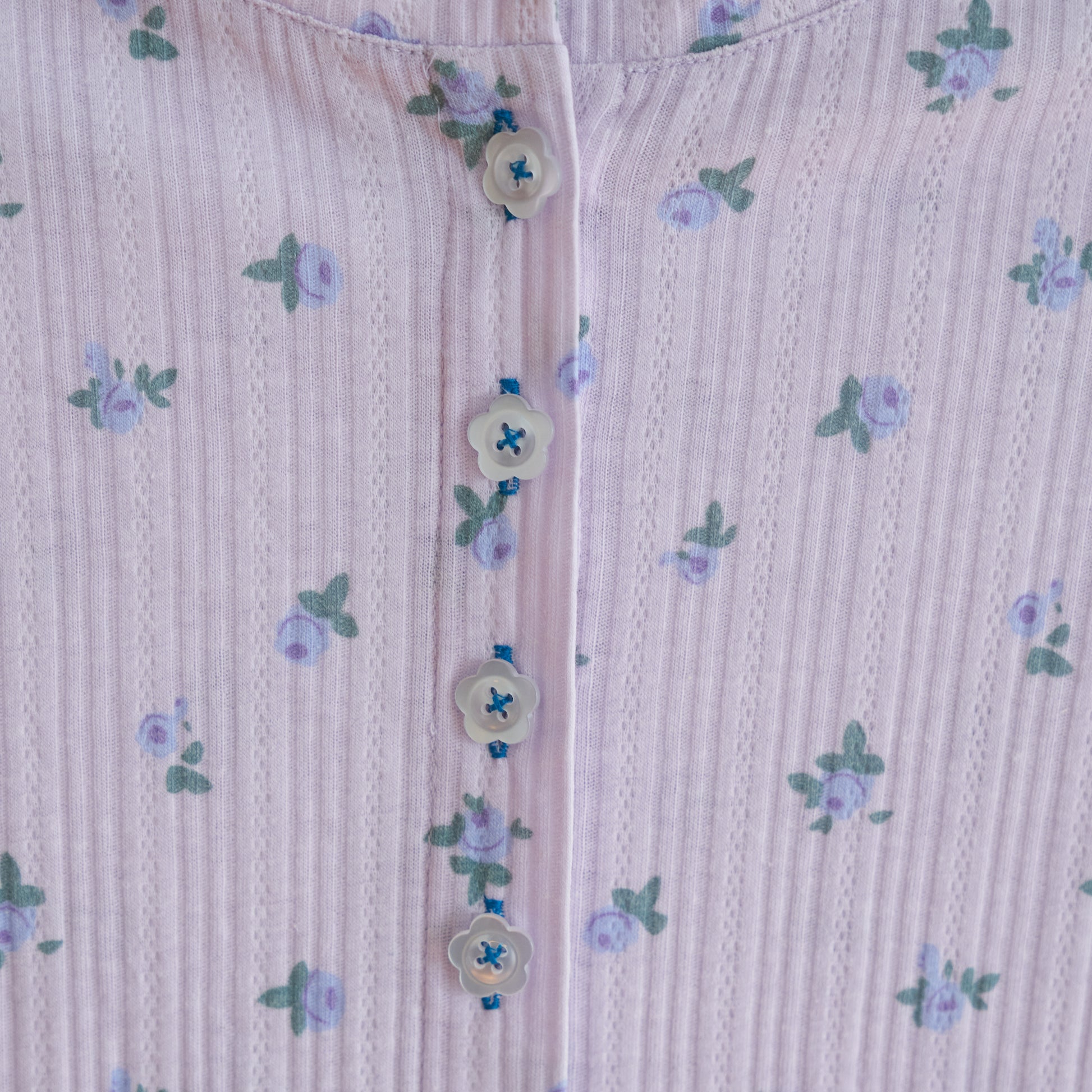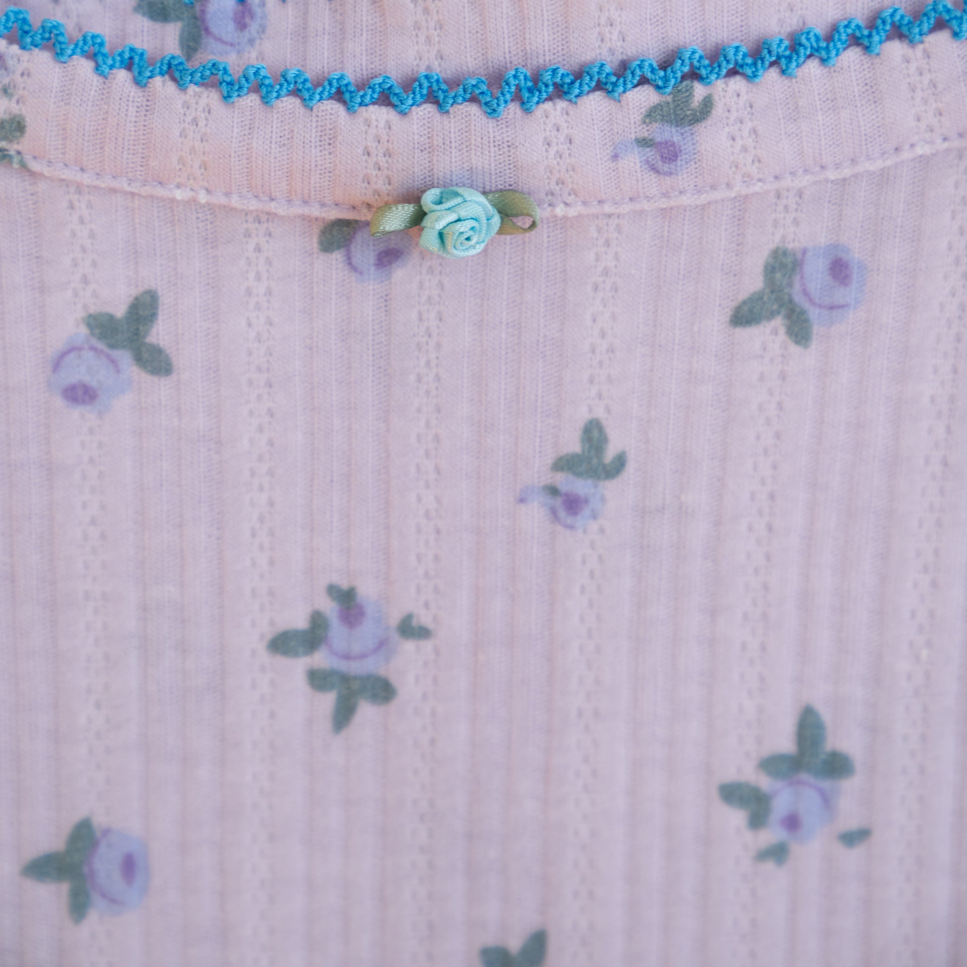 Evocative of the South of France in August, perfect rose puffs scattered across lavender pointelle. Turquoise crochet trim.