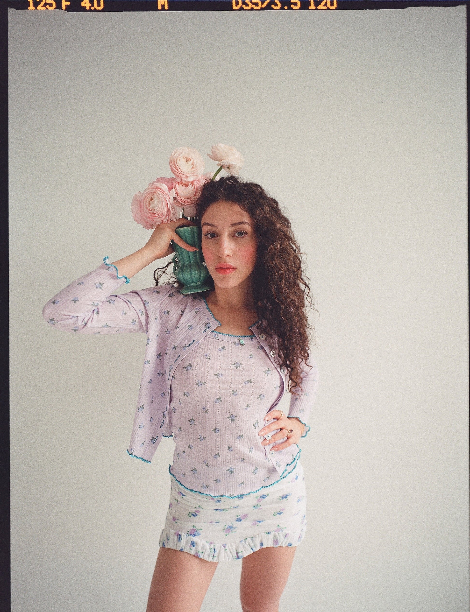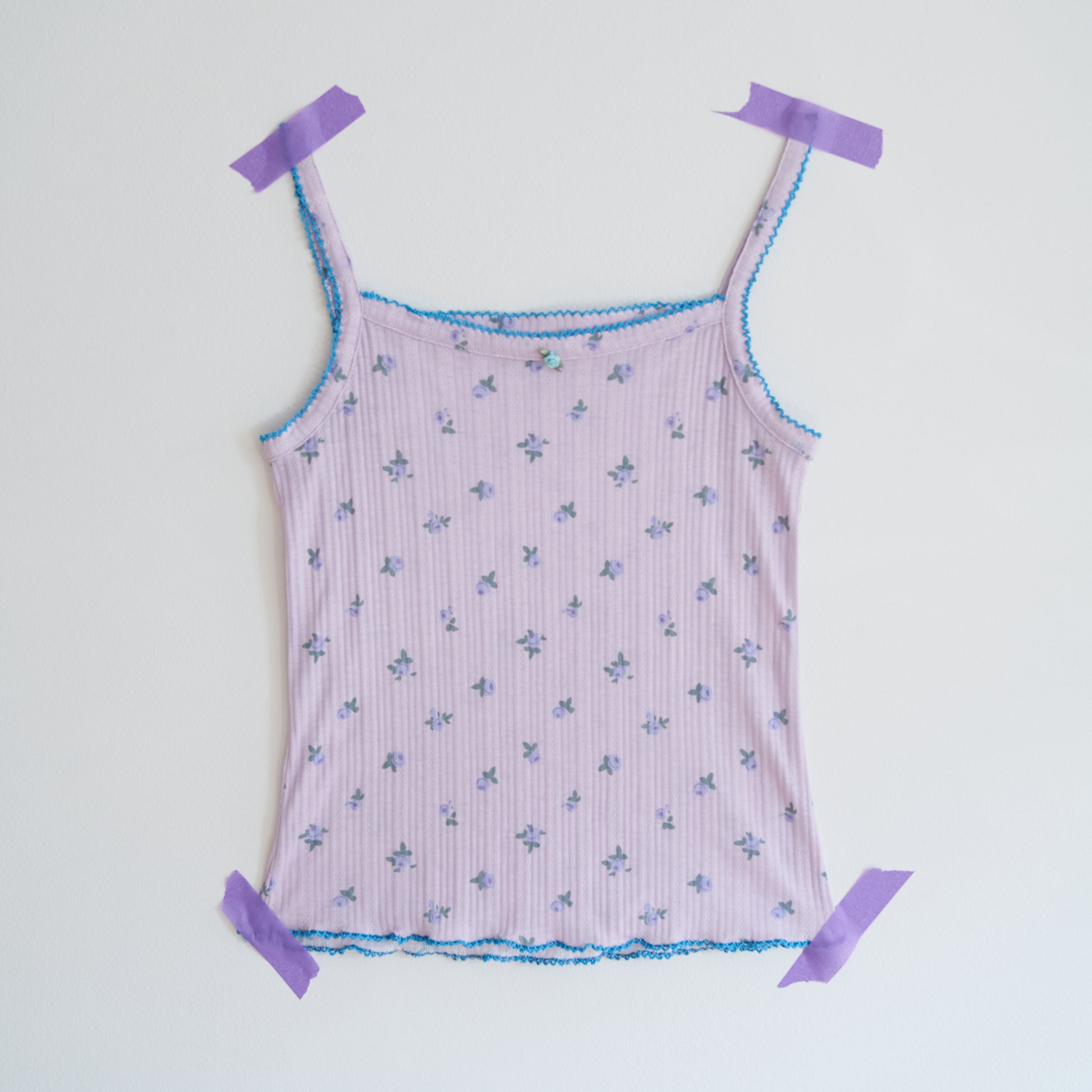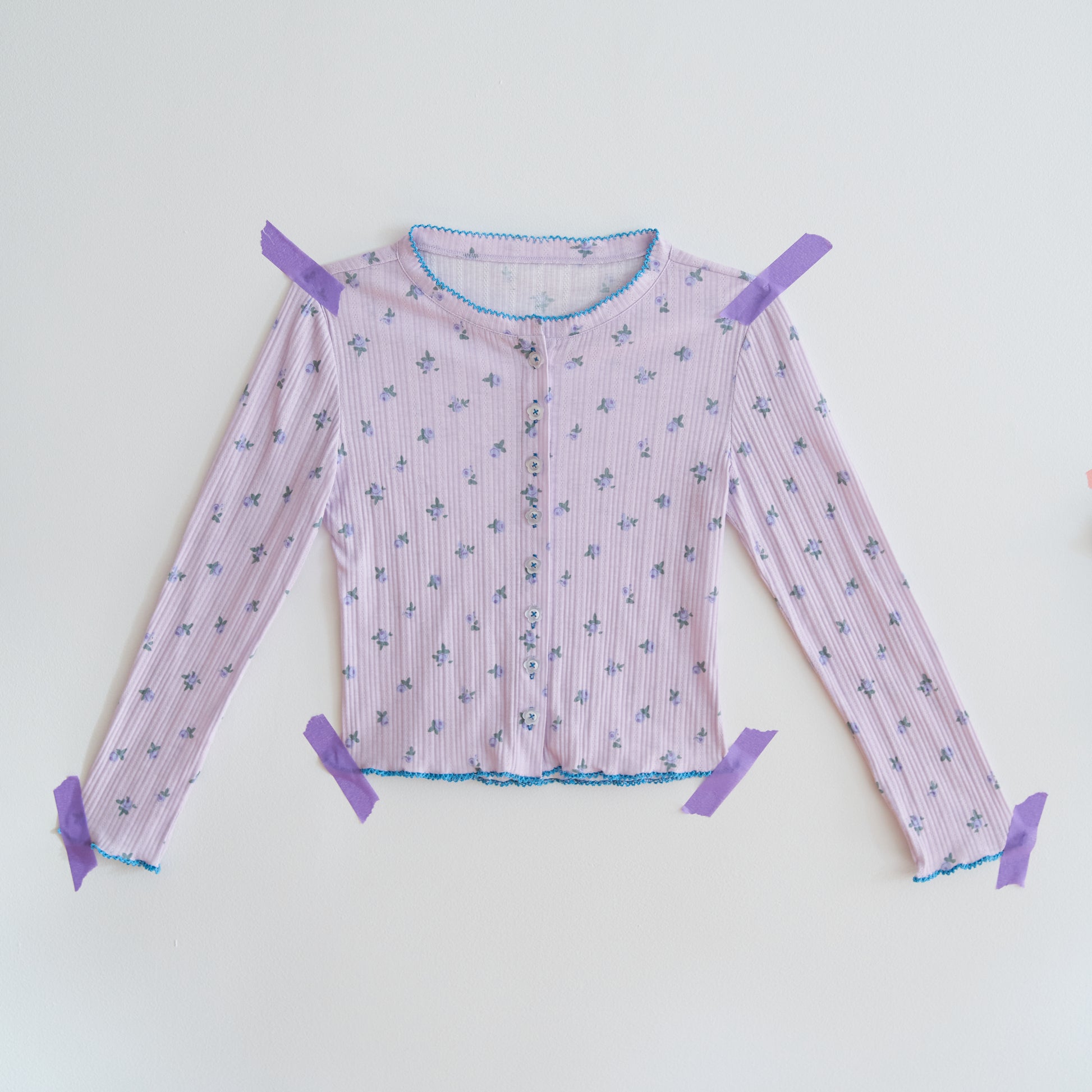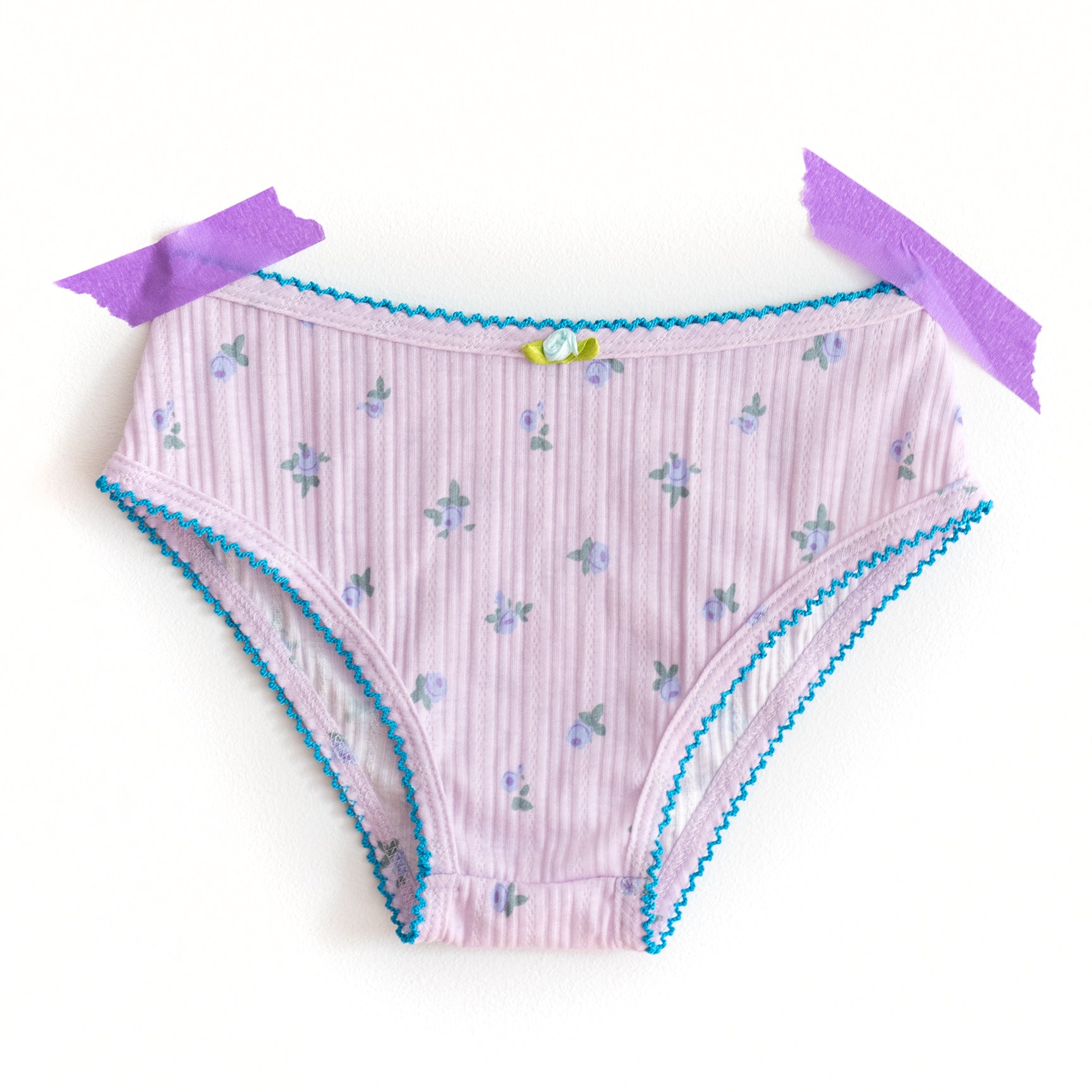 Evocative of the South of France in August, perfect rose puffs scattered across lavender pointelle. Turquoise crochet trim.