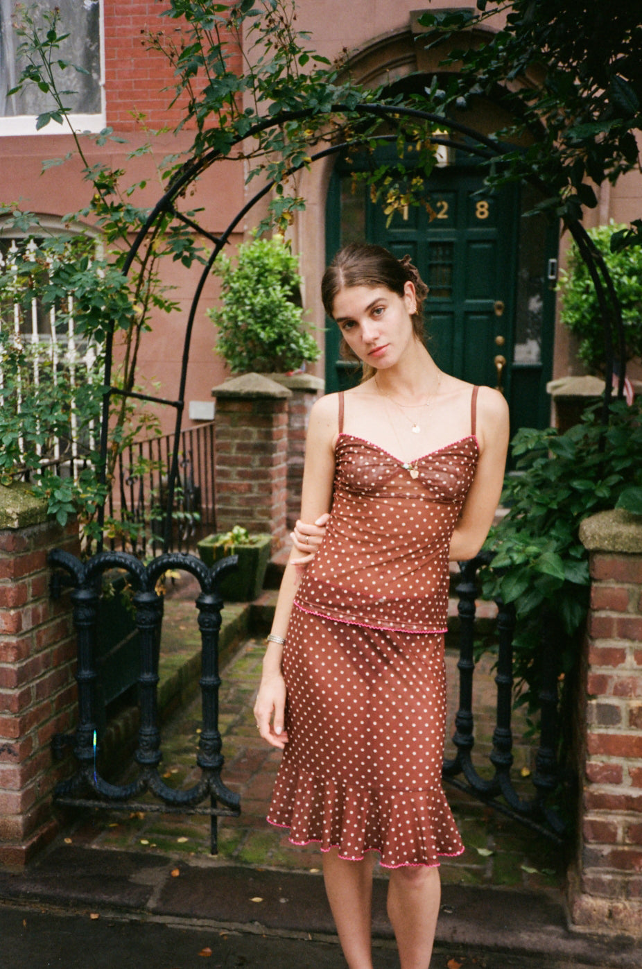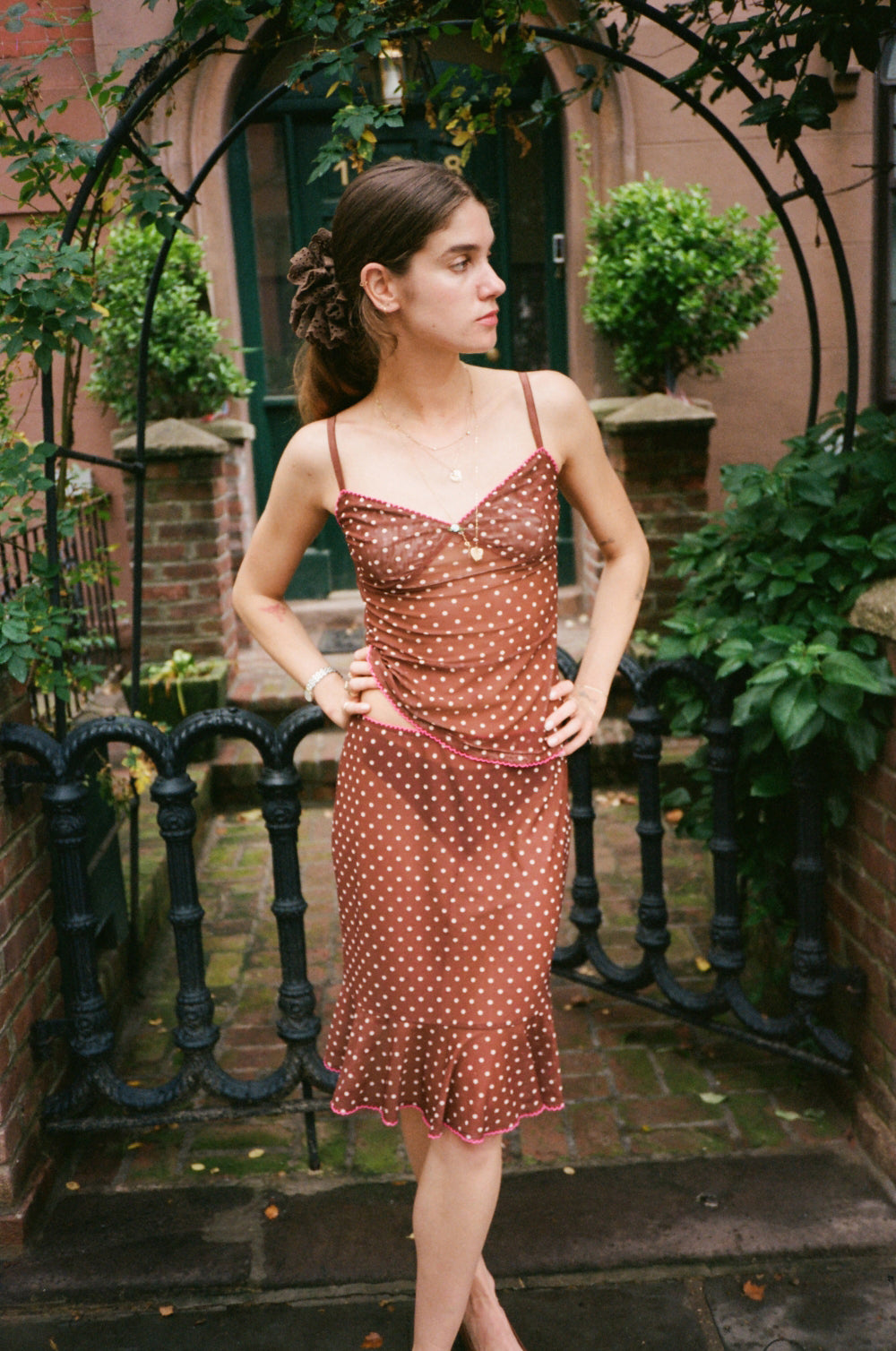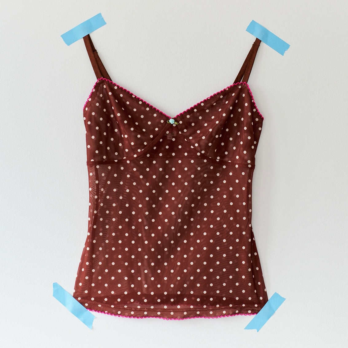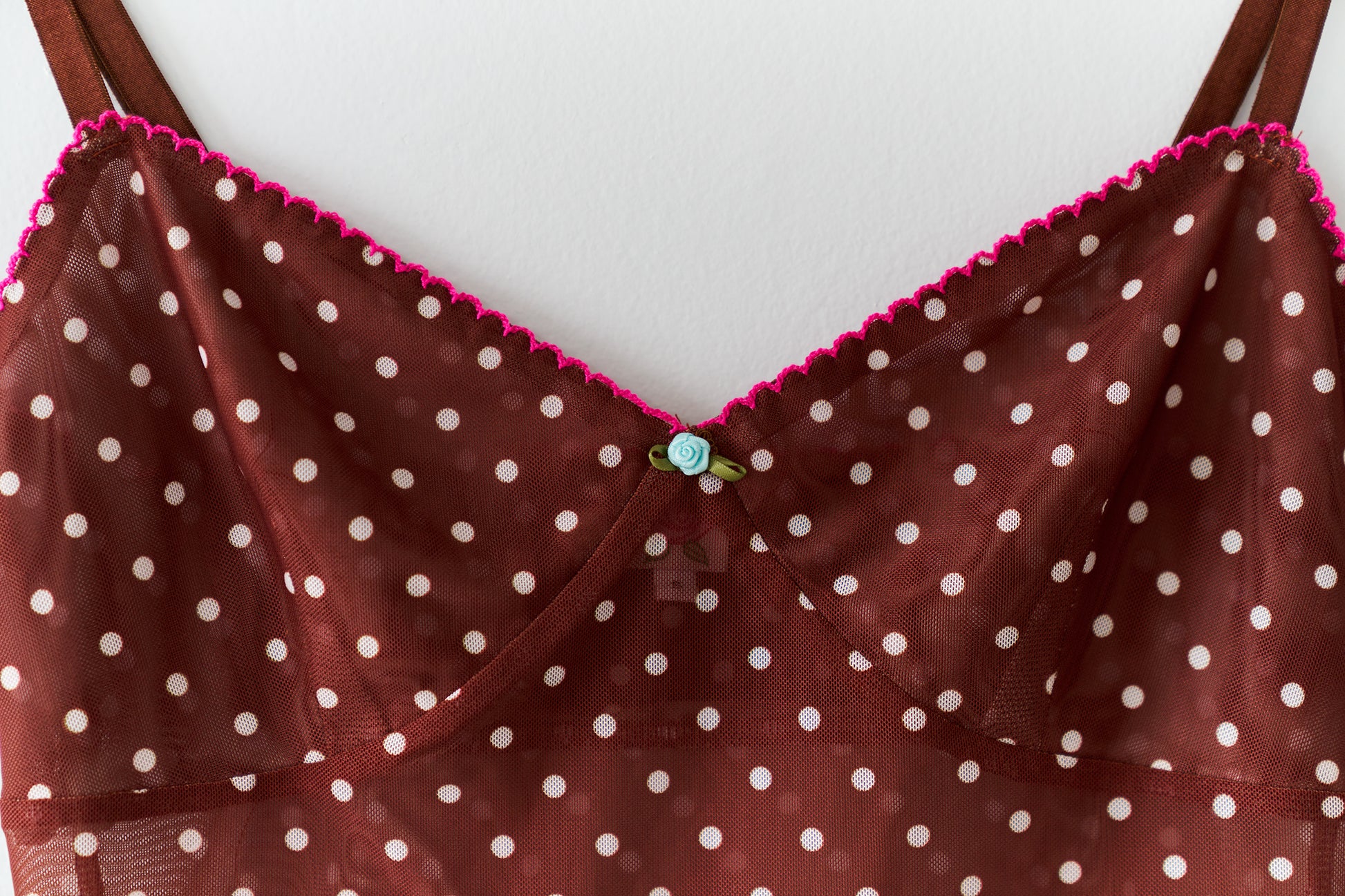 The body of the tank is sheer with an opaque bra (because we're nothing if not modest). Brown polka dot mesh finished with hot pink crochet and a teal rosette.