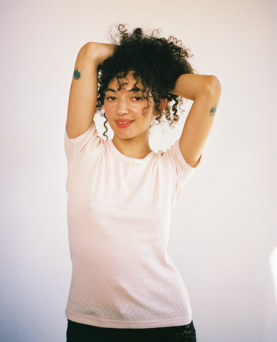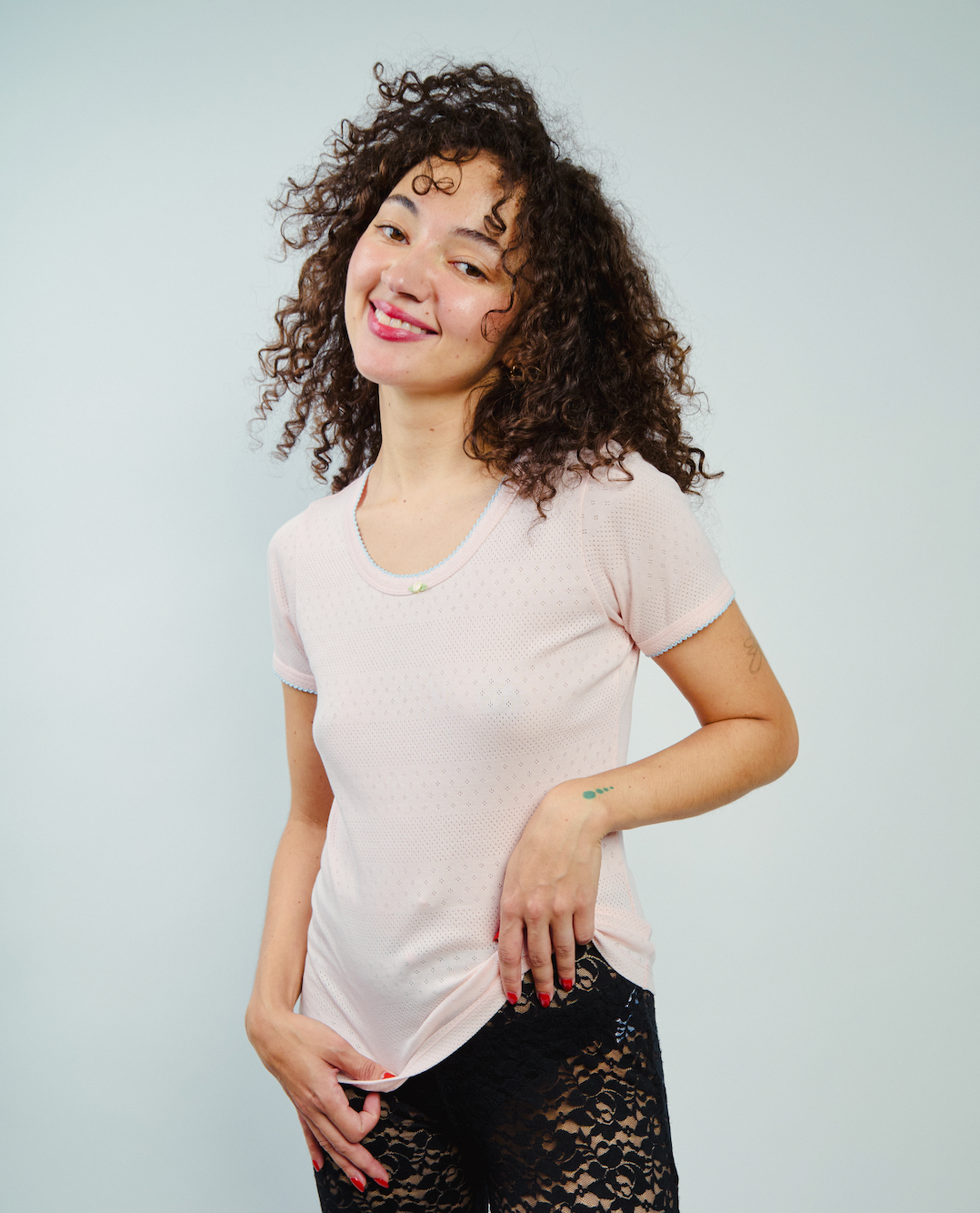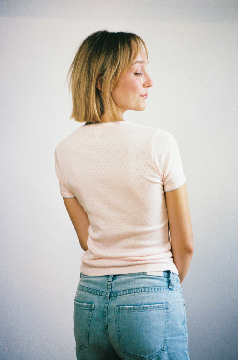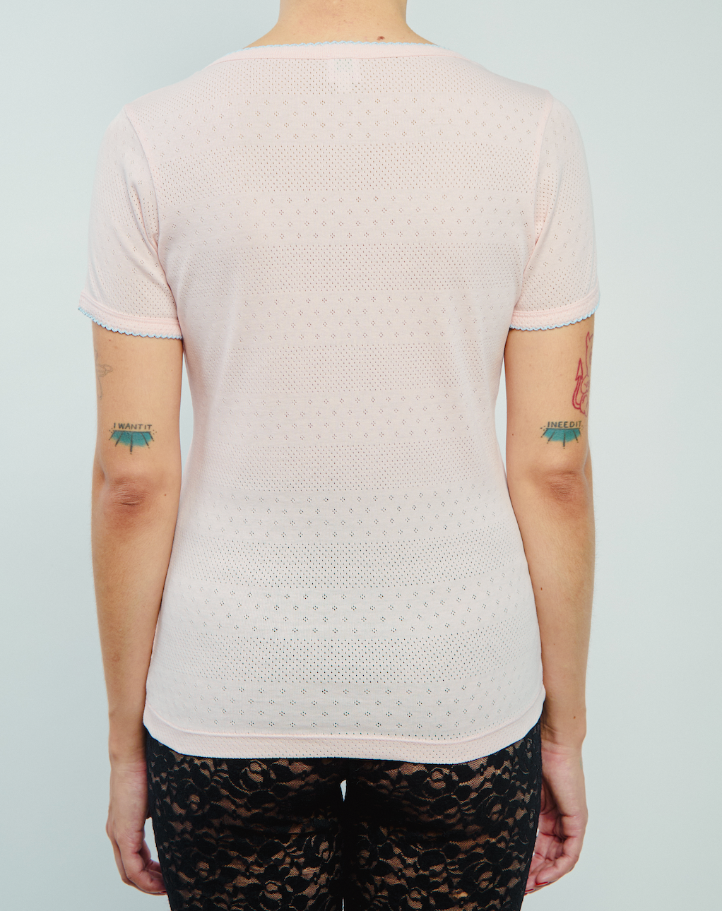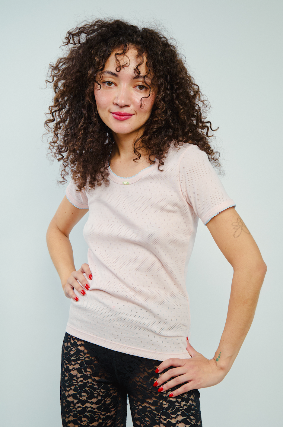 A wash of pale pink complimented by icy blue crochet and a butter yellow rosette. Composed of 100% cotton pointelle, this piece was designed with ultimate comfort in mind. The fabric is soft, plush and easy.