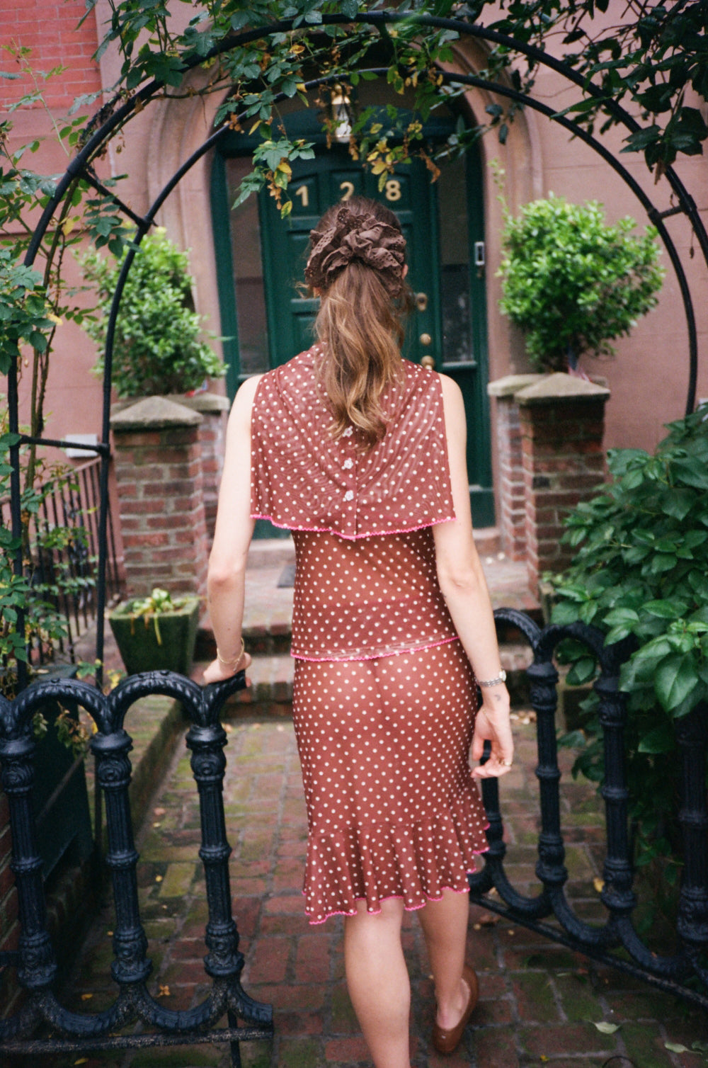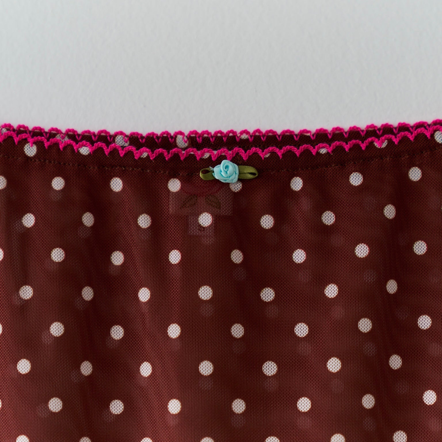 A mesh polka dot update on our perfect Tulip skirt. Sheer stretch mesh with our signature crochet edge. The best part is the sweet hem flounce. A satin rosette to sweeten the deal. Our mesh is super sturdy and light, we can't imagine anything better, truly.