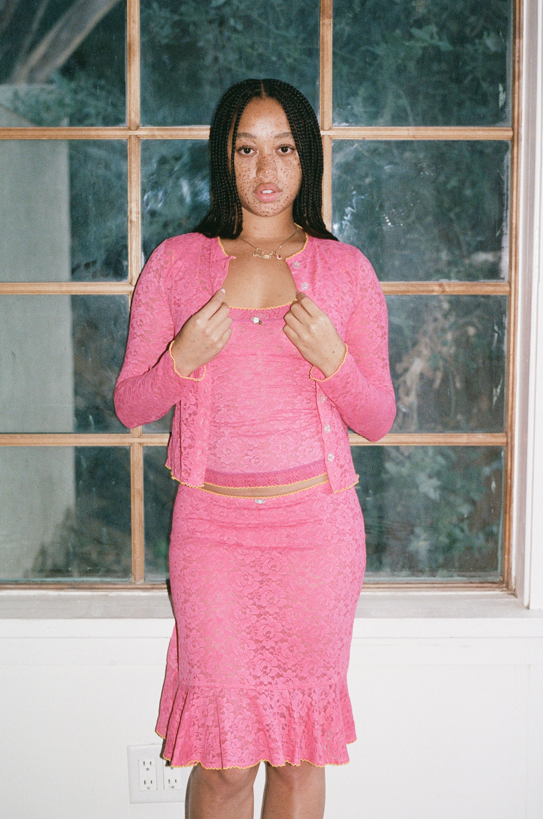 Our version of the perfect early aughts Midi skirt. Sheer stretch lace with our signature crochet edge. The best part is the sweet hem flounce. A satin rosette to sweeten the deal.