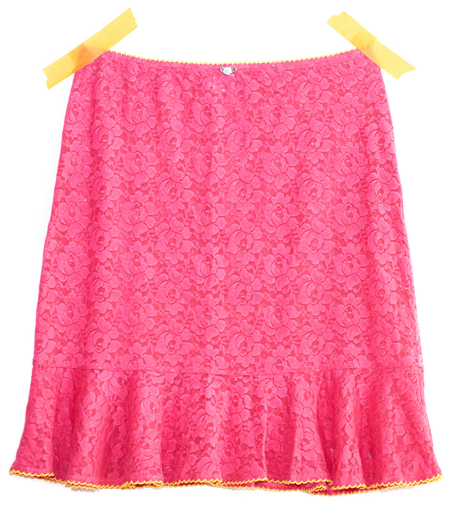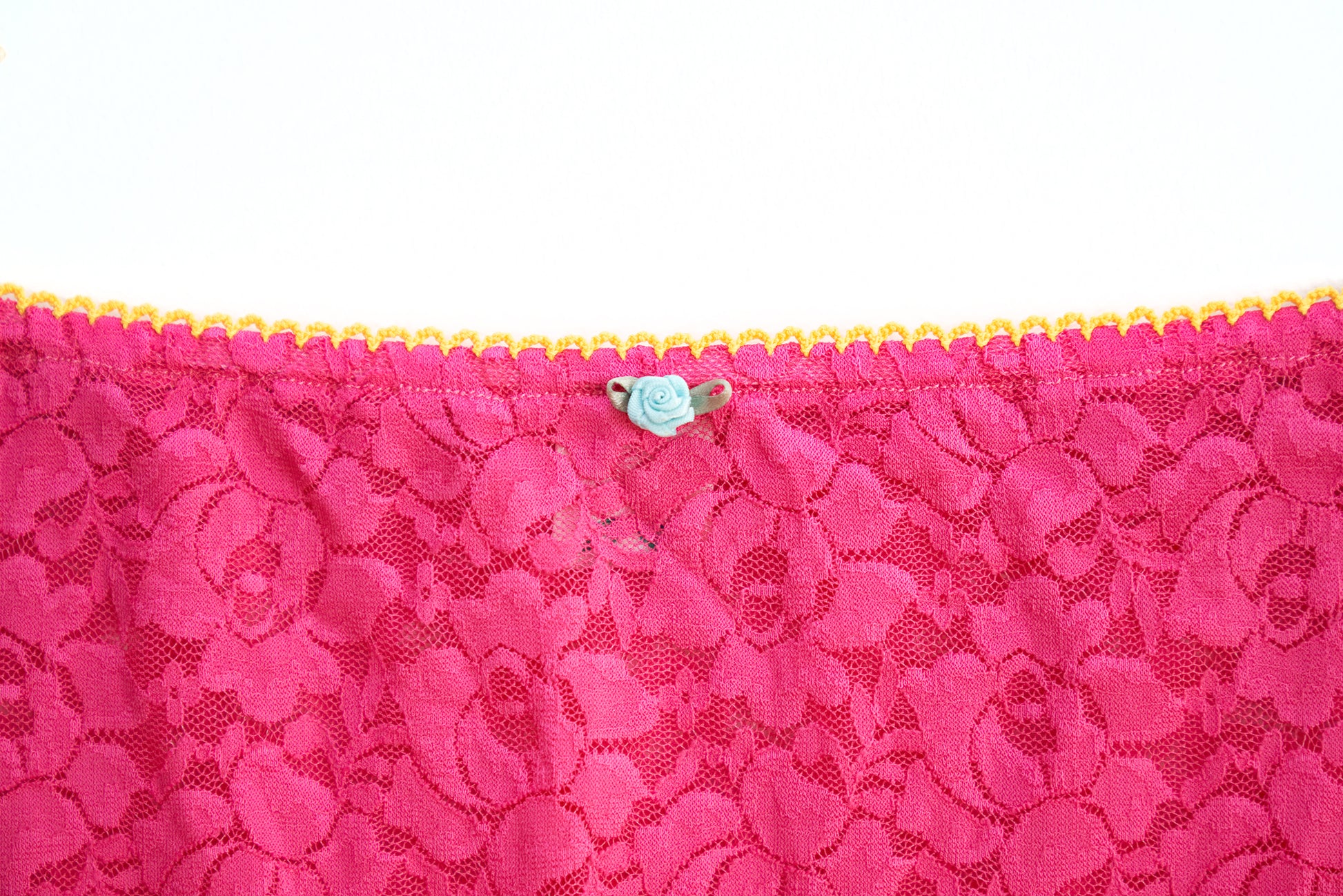 Magenta lace with orange crochet trim and one perfect aqua rosette.