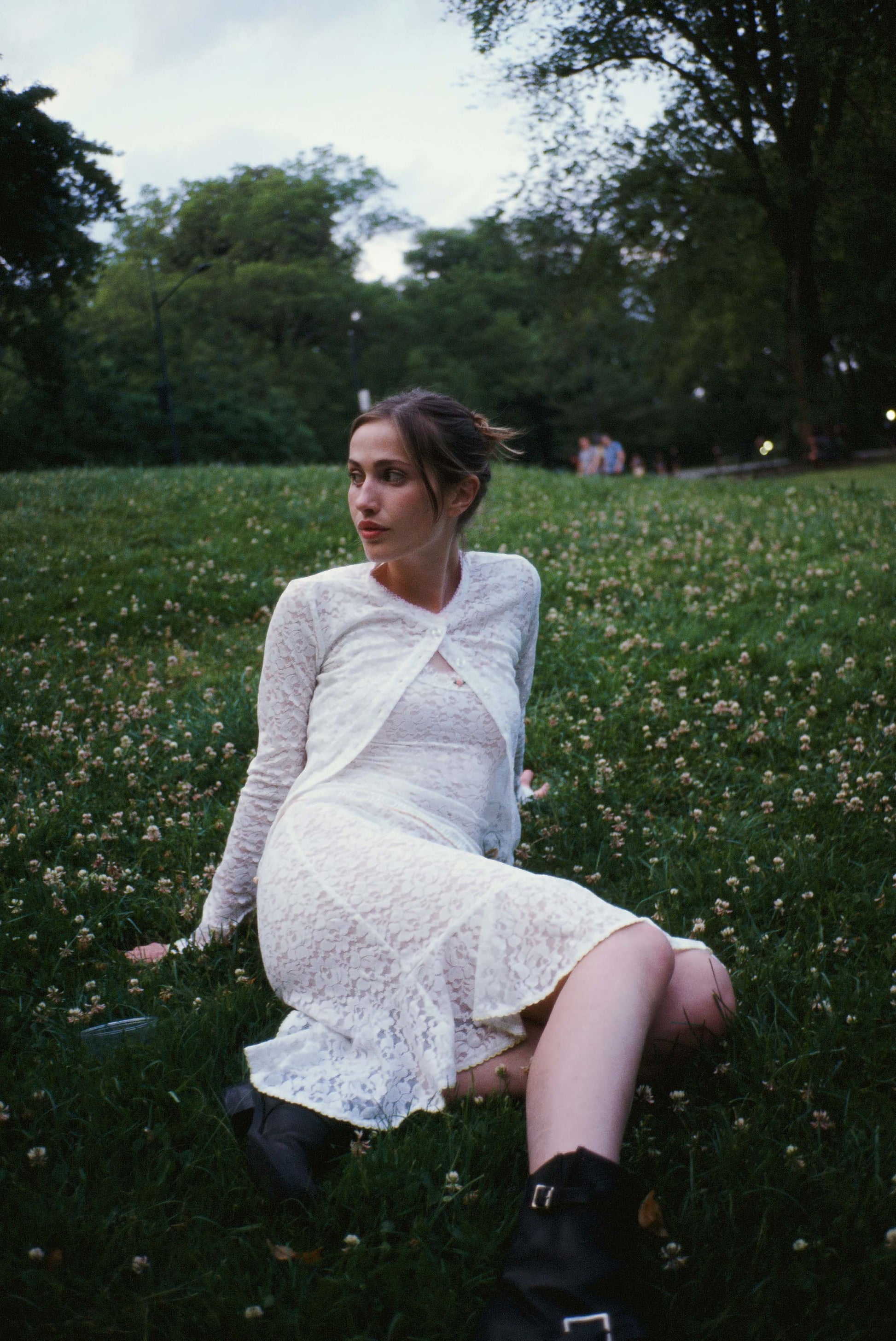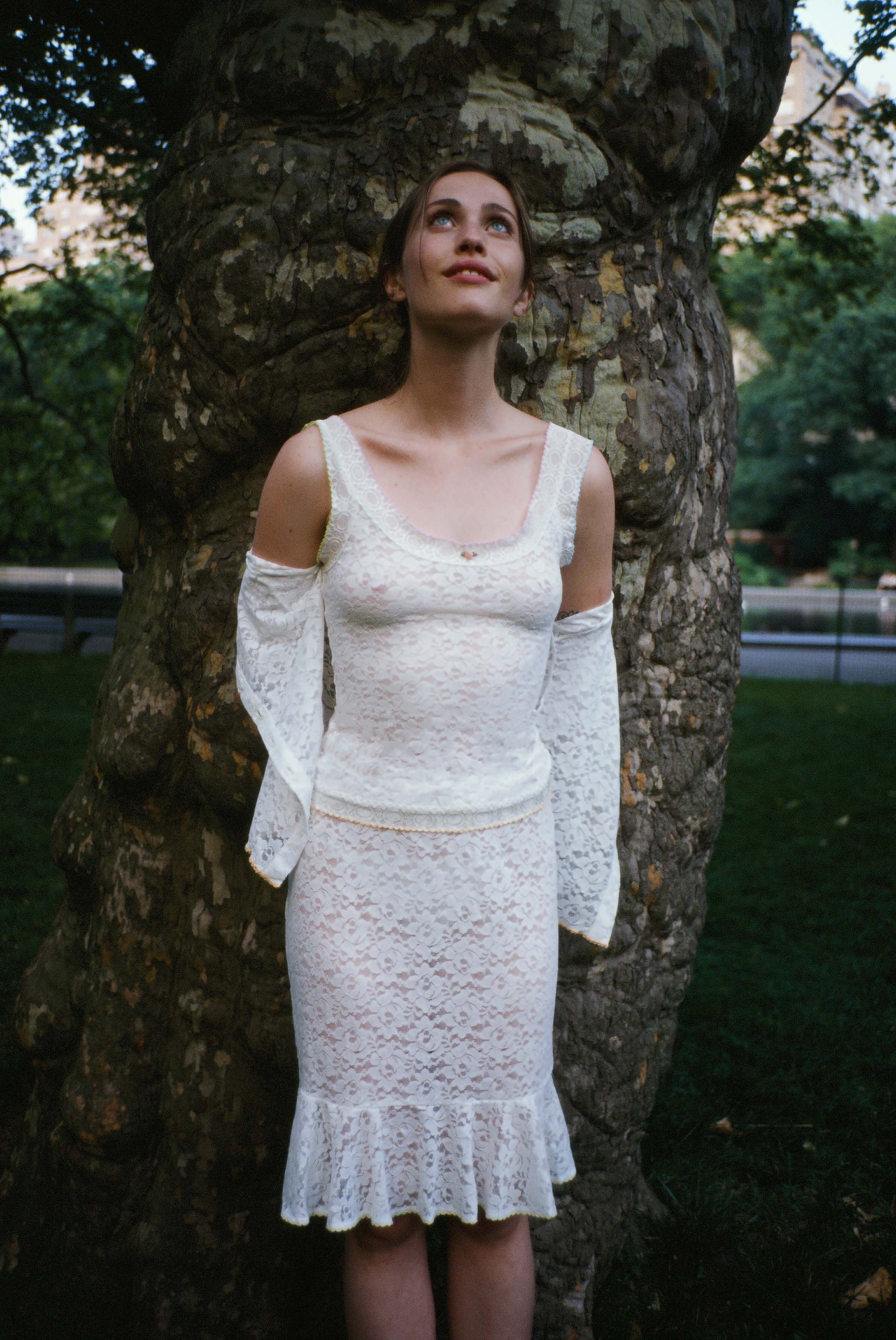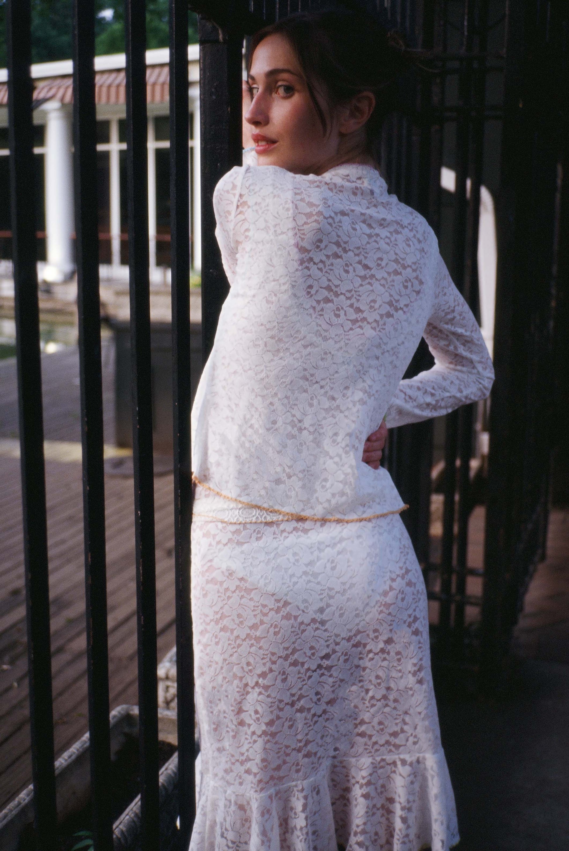 Our version of the perfect early aughts midi skirt. Sheer stretch lace with our signature crochet edge. The best part is the sweet hem flounce. A satin rosette to sweeten the deal.