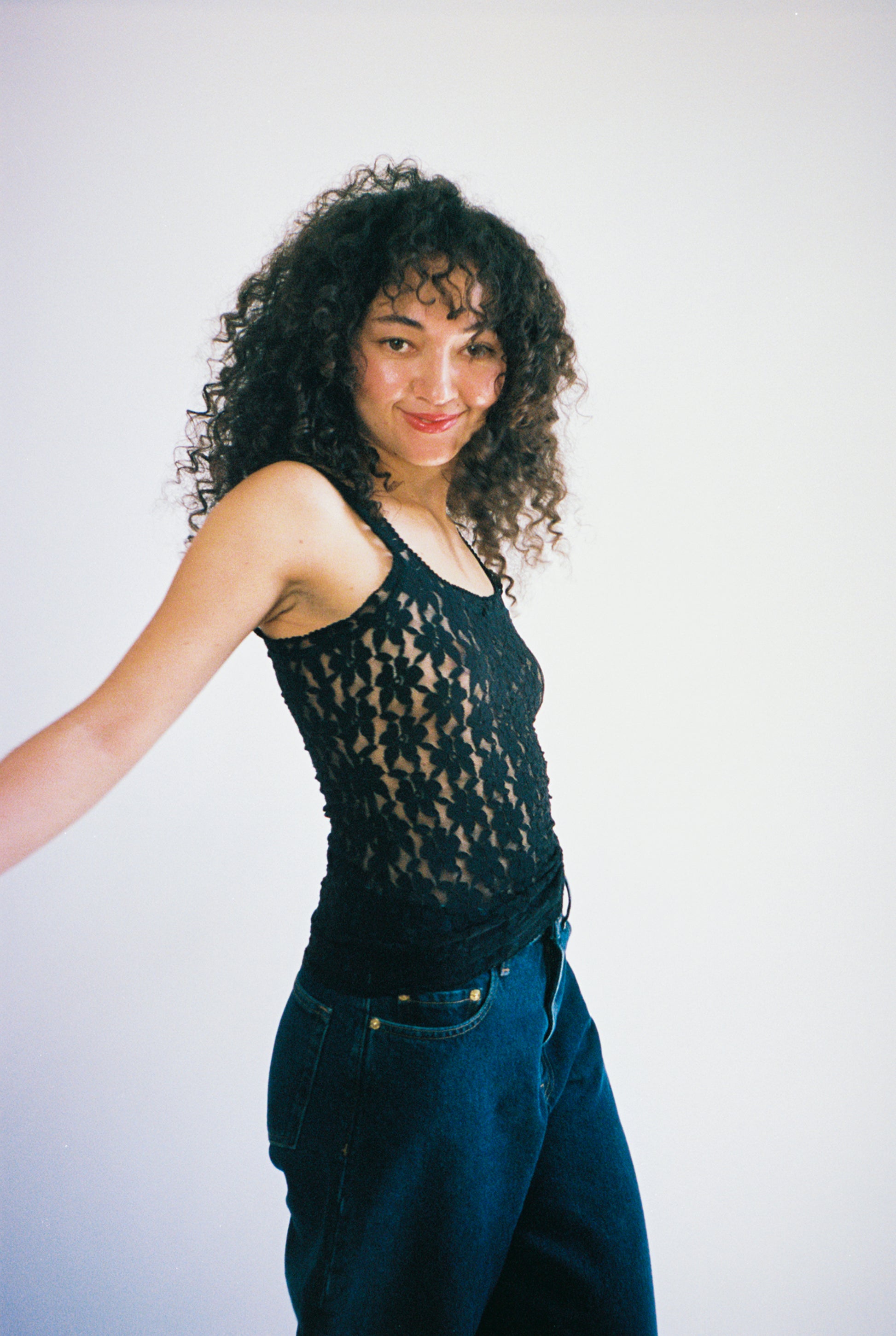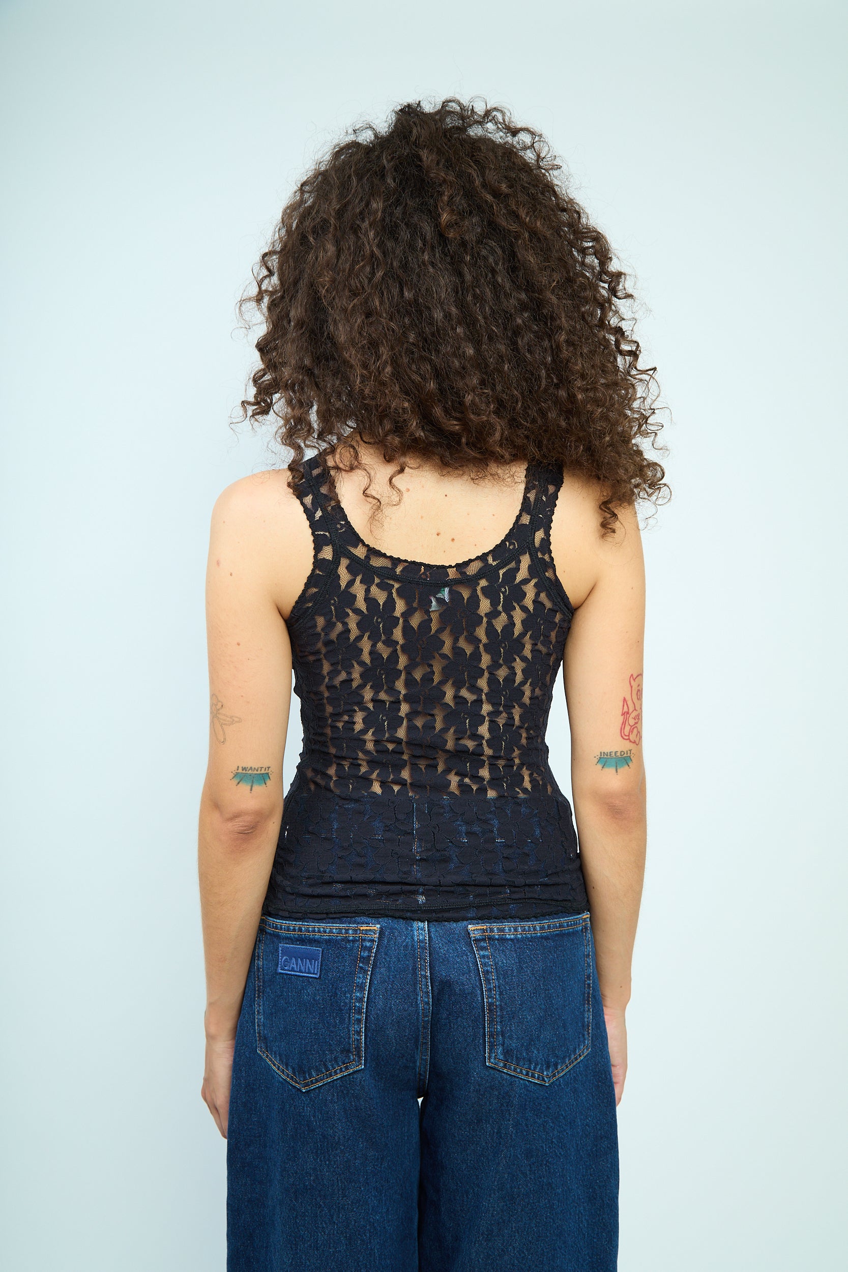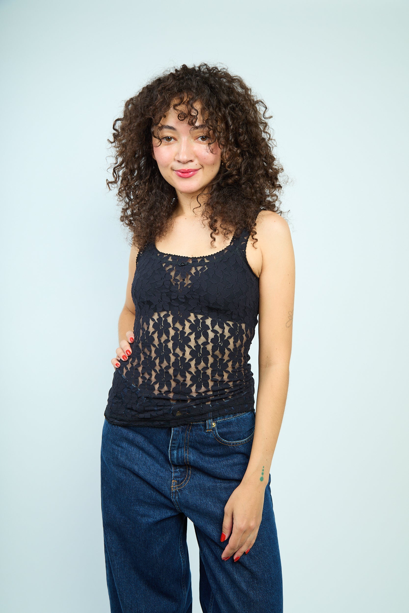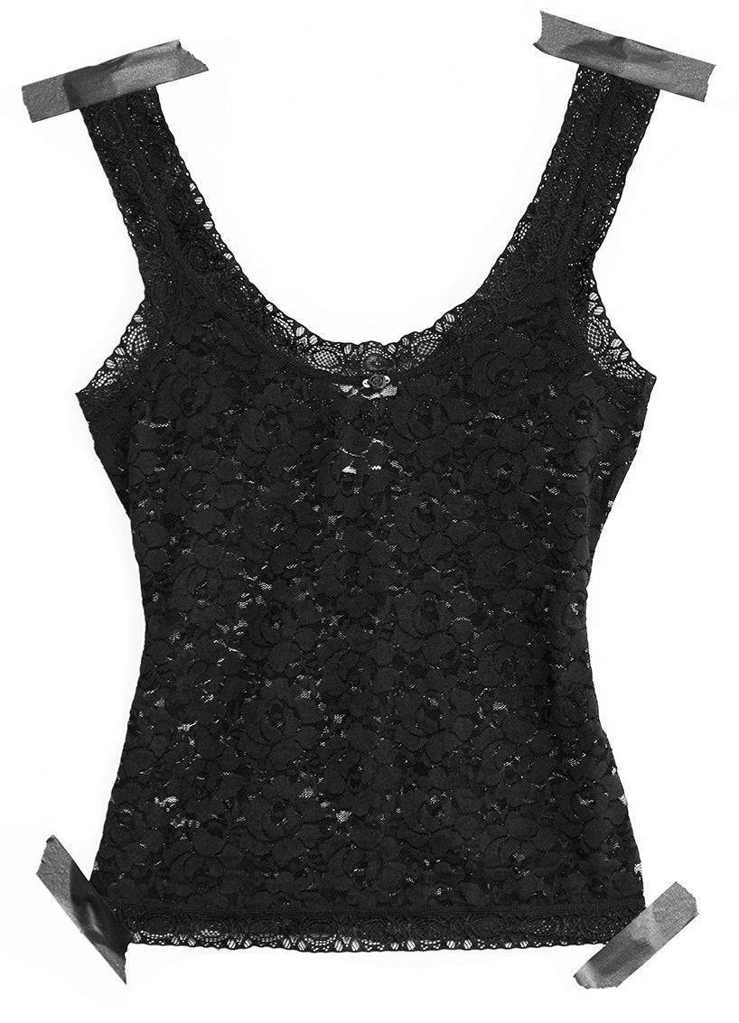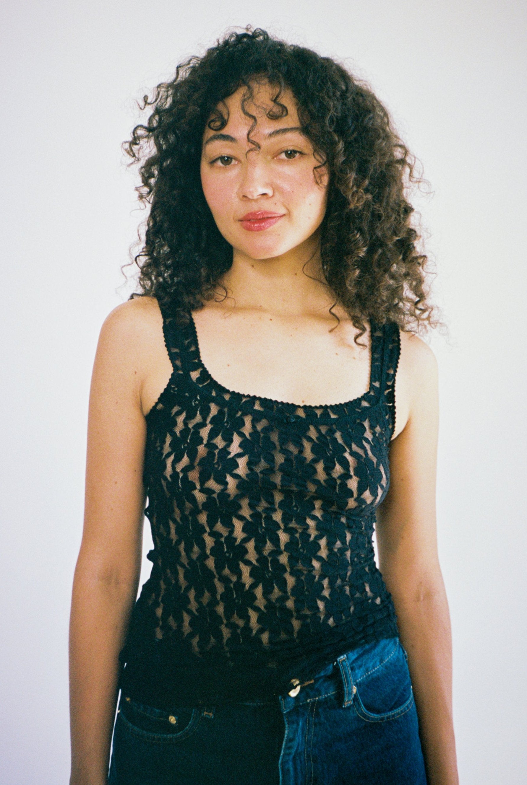 The Tulip Tank is best friends with the Tulip Cardigan and Skirt. Together they create one of our favorite put together + sexy looks. Works great with a visible bra (or not!). Sheer stretch black lace with black satin rosette and black crochet trim.